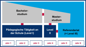 - Während des Bachelorstudiums wirst Du als pädagogische Unterstützungskraft und während des ersten Jahres des Masterstudiums als Aushilfslehrkraft tätig sein. Pädagogisch-didaktische Inhalte aus dem Referendariat werden bereits während des Studiums vermittelt und im letzten Masterjahr bist du schon als Referendarin bzw. Referendar tätig.